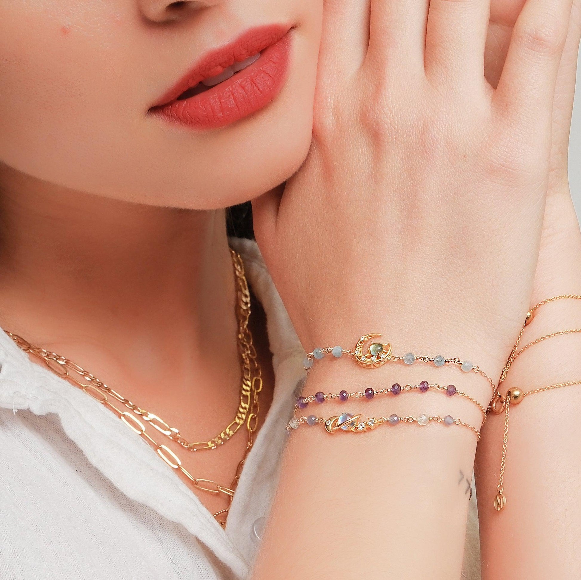 Handcrafted, stationed Amazonite beads adds a flirty pop of color to the bracelet with the moon and star charm detailed with a dazzling Amazonite stone and sparkling cubic zirconia.